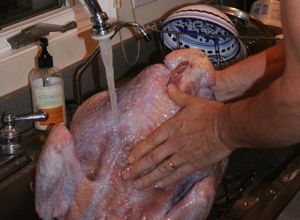 4. Rinse the bird in the sink, for five to 10 minutes. Just keep rinsing it, inside and out. Rinse, rinse, rinse. [at right]
