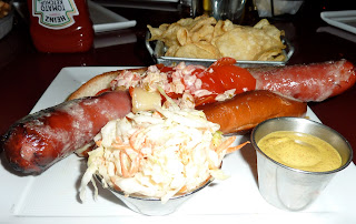 On the same visit as the calamari – an early Sunday evening — it felt as though the kitchen had yet to recover from the devastation that brunch service often inflicts on a restaurant. A New York sirloin ($28.50), medium rare, was flavorful but too tough. The country style garlicky, cheesy potatoes that sided it, however, won my friend’s heart with their mixture of crispiness and soft potato goodness. The Kobe twin mini burgers ($12), ordered with bacon (add on $1.50), cheddar (add on $1.50), and caramelized onions (add on $.50), weren’t as tasty as the full sized Kobe burger with feta and arugula ($16) we enjoyed on an earlier visit, or the regular beef burger ($9) we’d had the night before. And I was disappointed with the salmon burger: it tasted fishier than salmon does. But, the delicious foot-long, thick Kobe hotdog (a laughably ugly specimen if ever there was one) had the snappy bite of a good naturally-cased dog.